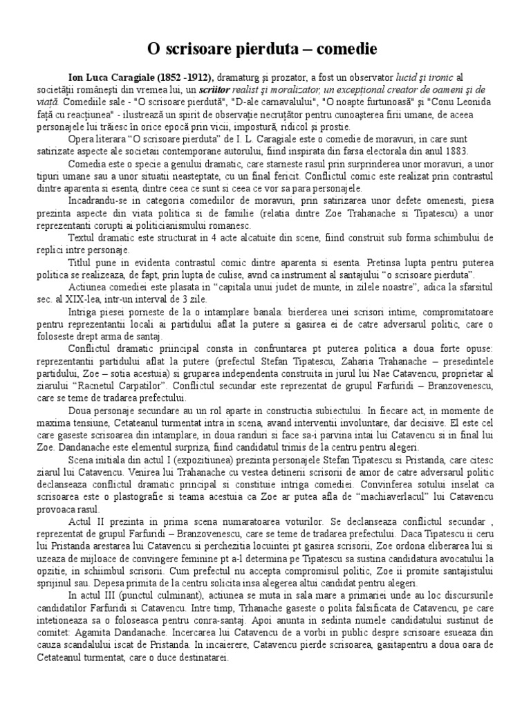 O scrisoare pierduta eseu bac. Conceptul de comedie este intalnit in primul rand in Poetica lui Aristotel. Tema si viziunea O scrisoare pierdută Opera O scrisoare pierdută scrisa de Ion Luca Caragiale este publicata in revista Convorbiri literare in anul 1885. O scrisoare pierduta publicata in 1883 este cea de-a doua comedie scrisa de Caragiale urmand O noapte furtunoasa si precedand Conu Leonida fata cu reactiunea si D-ale carnavalului.